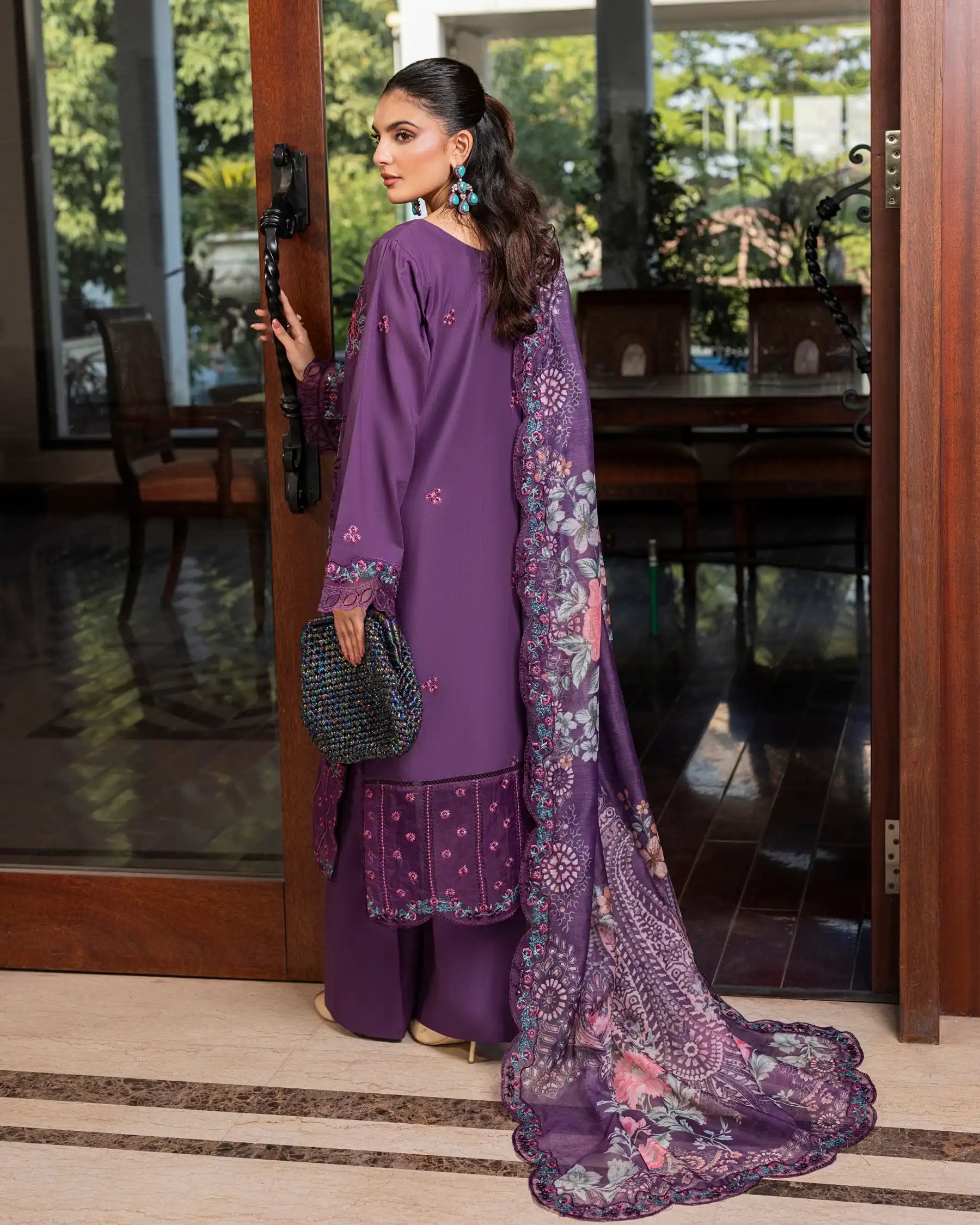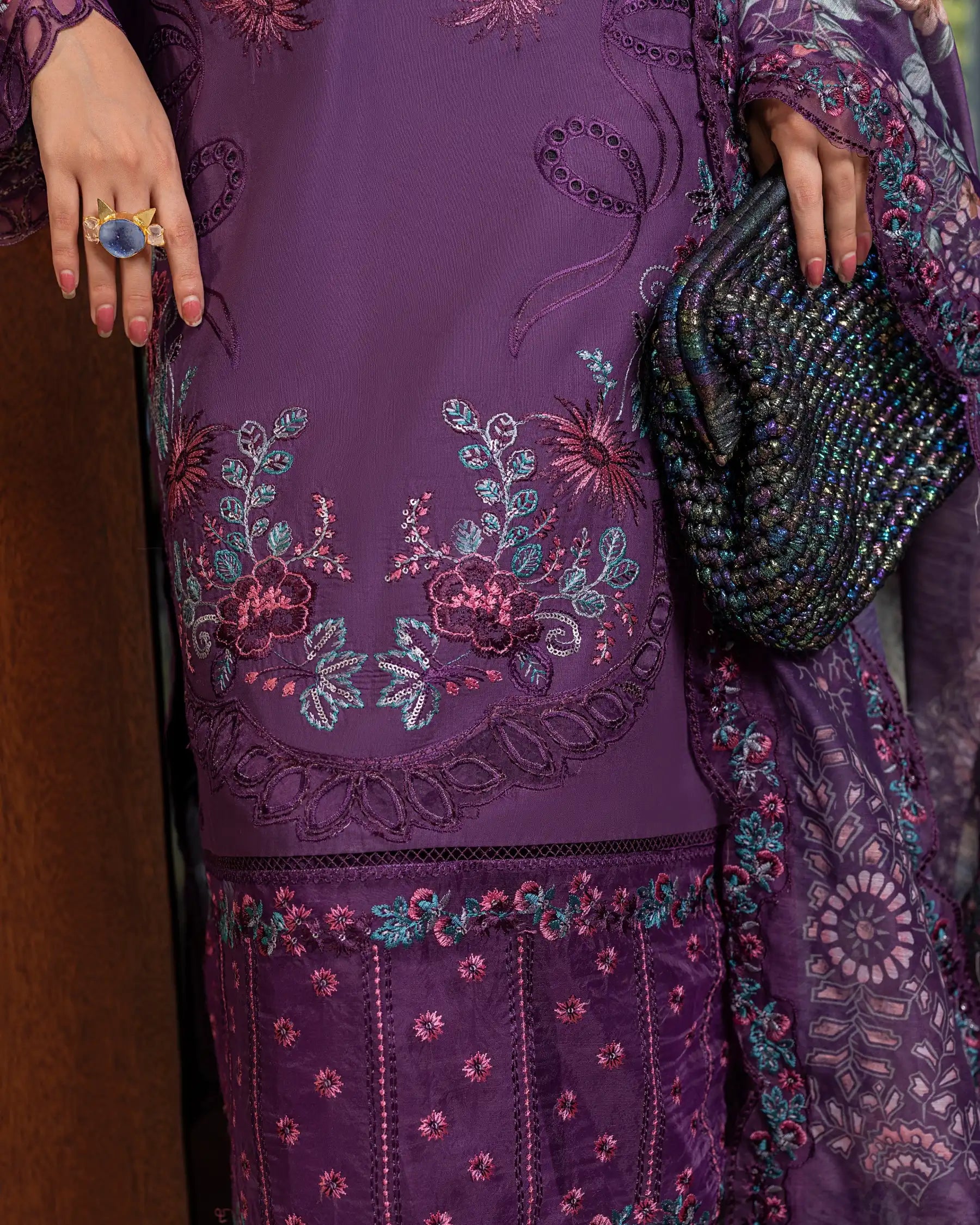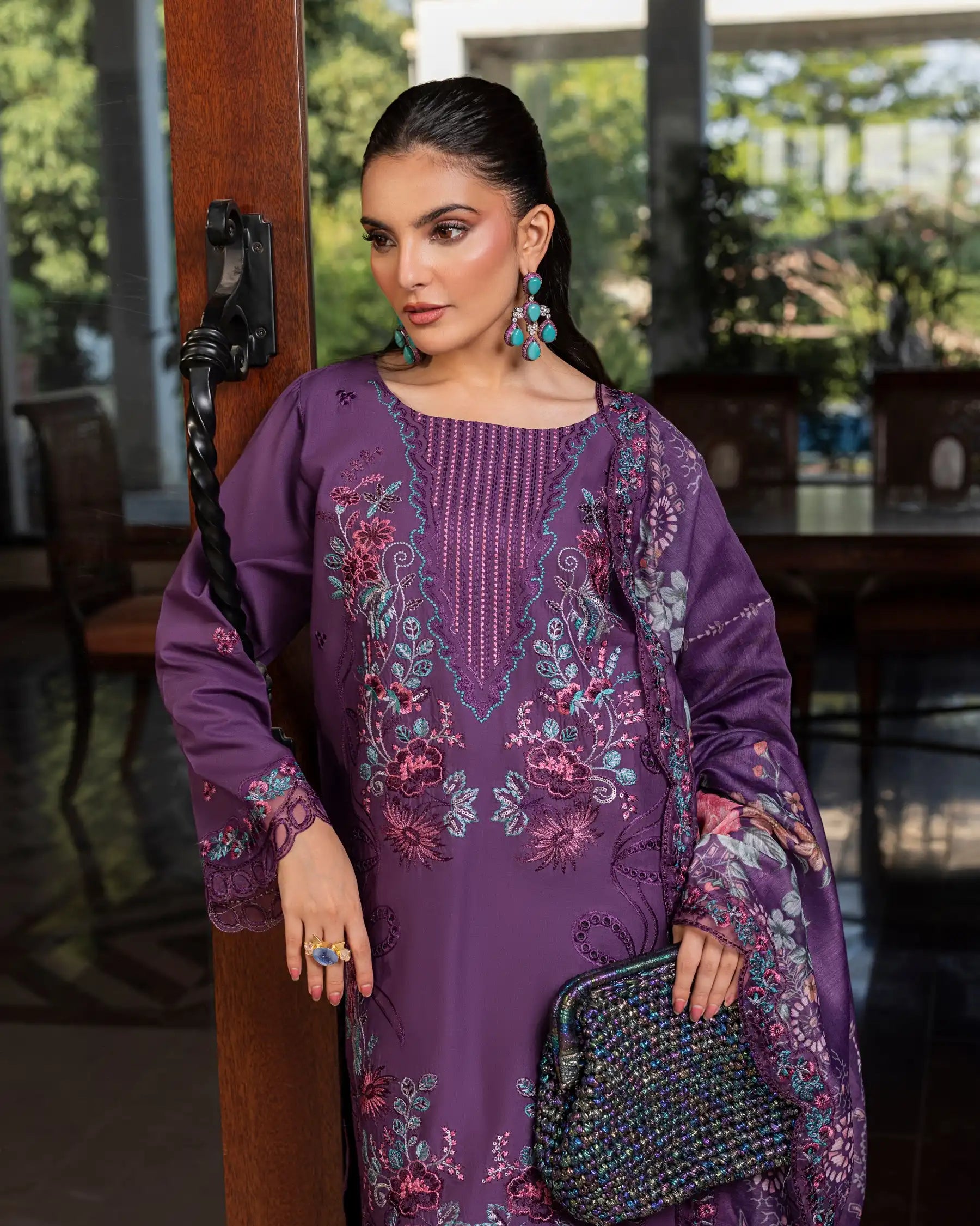 Unveil botanical beauty with GP-LW-003, a gracefully stitched 3-piece embroidered lawn suit from the Gul Posh Collection. Featuring a rich plum base, this breathable lawn shirt is adorned with floral embroidery inspired by botanical motifs, enhanced with contrast threadwork and elegant detailing on the sleeves and hem.